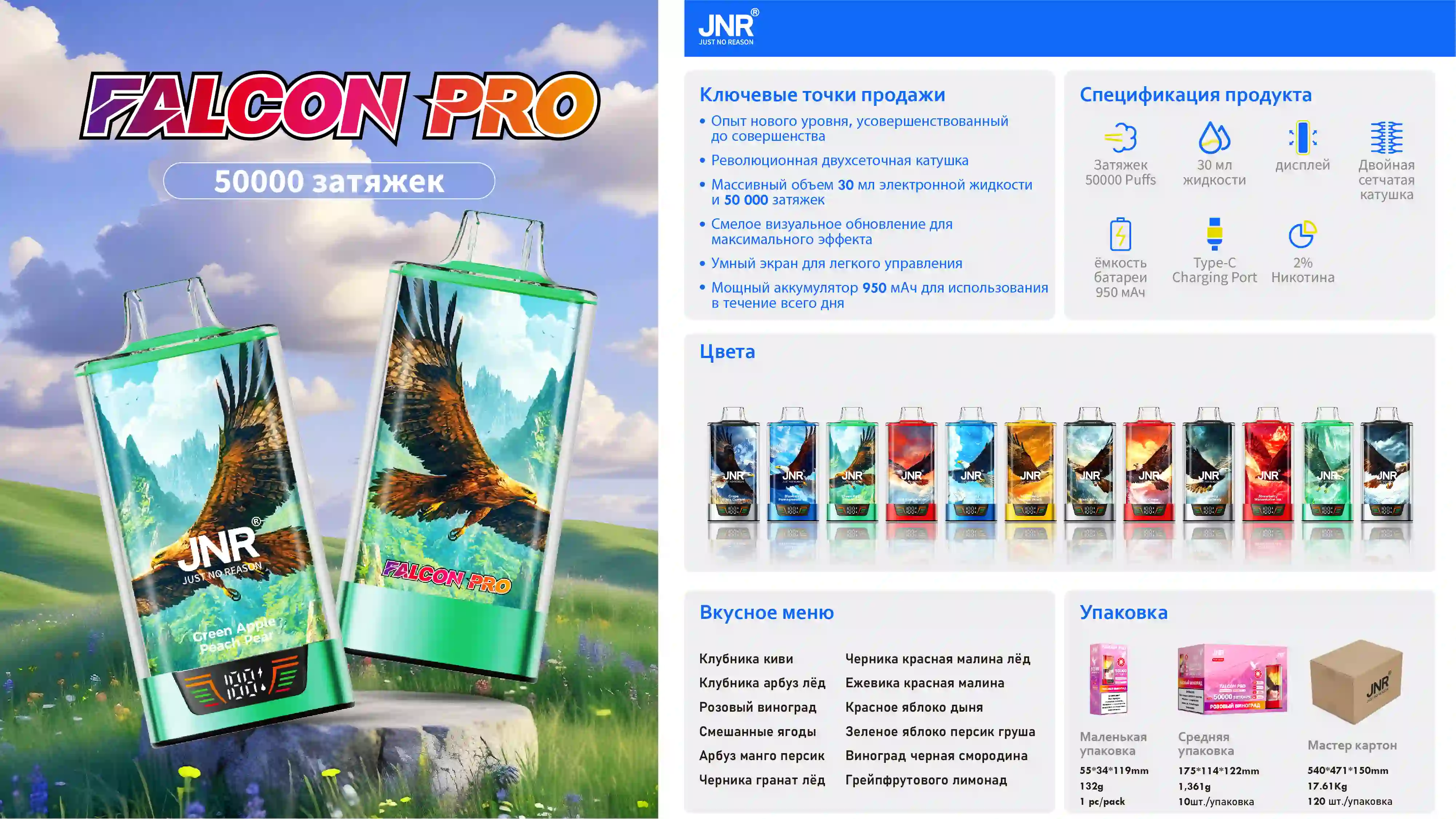 Этот вейп идеально подойдёт как новичкам, так и опытным пользователям, которые ценят надёжность, качество и долгий срок службы. Если вы хотите купить электронную сигарету, которая сочетает в себе технологии, стиль и функциональность, JNR Falcon Pro 50000 станет идеальным выбором.